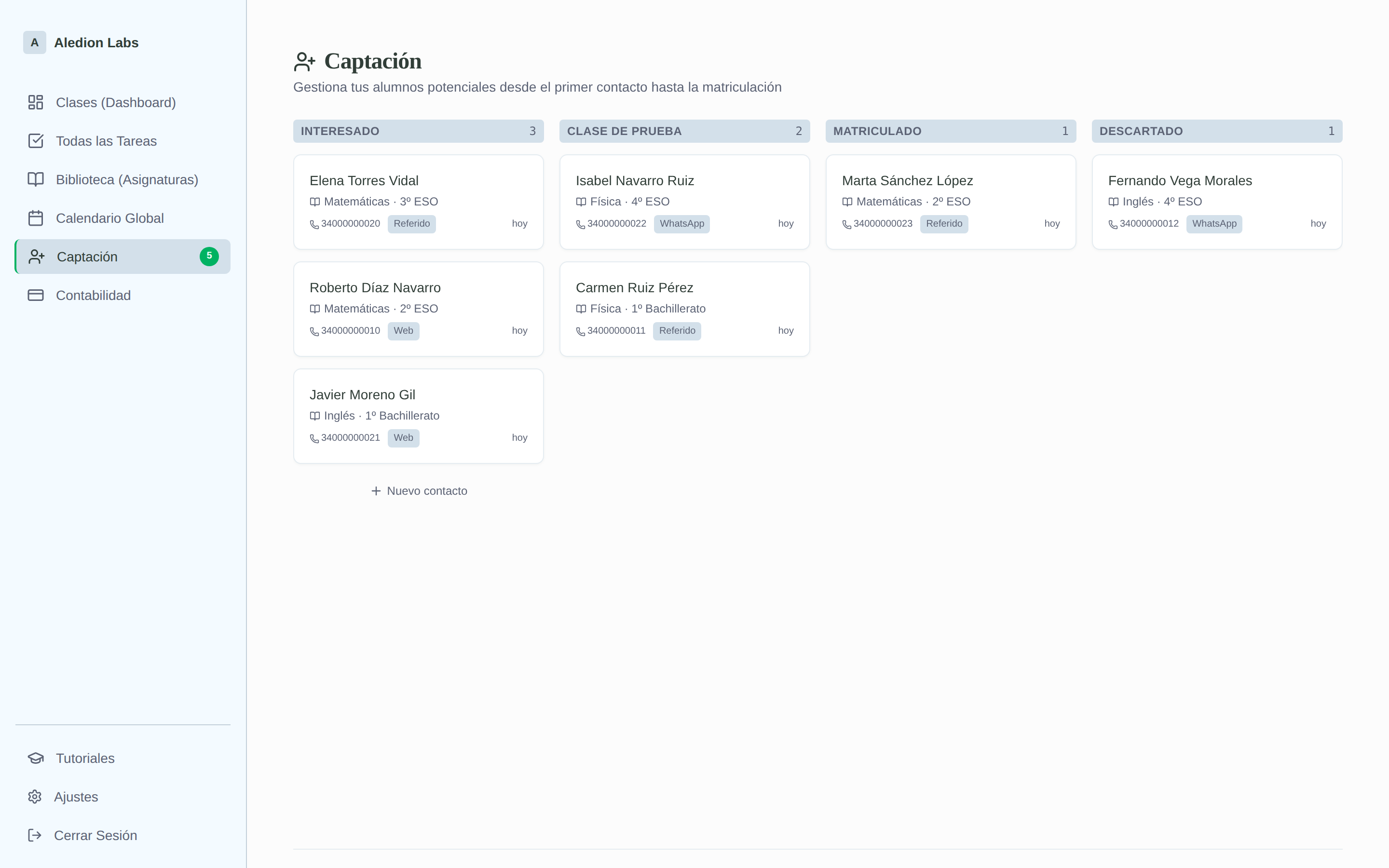 Haz clic en cualquier tarjeta de lead para ver su ficha detallada. Desde ahí puedes editar todos sus datos: contacto, alumno, asignatura, notas, etc.