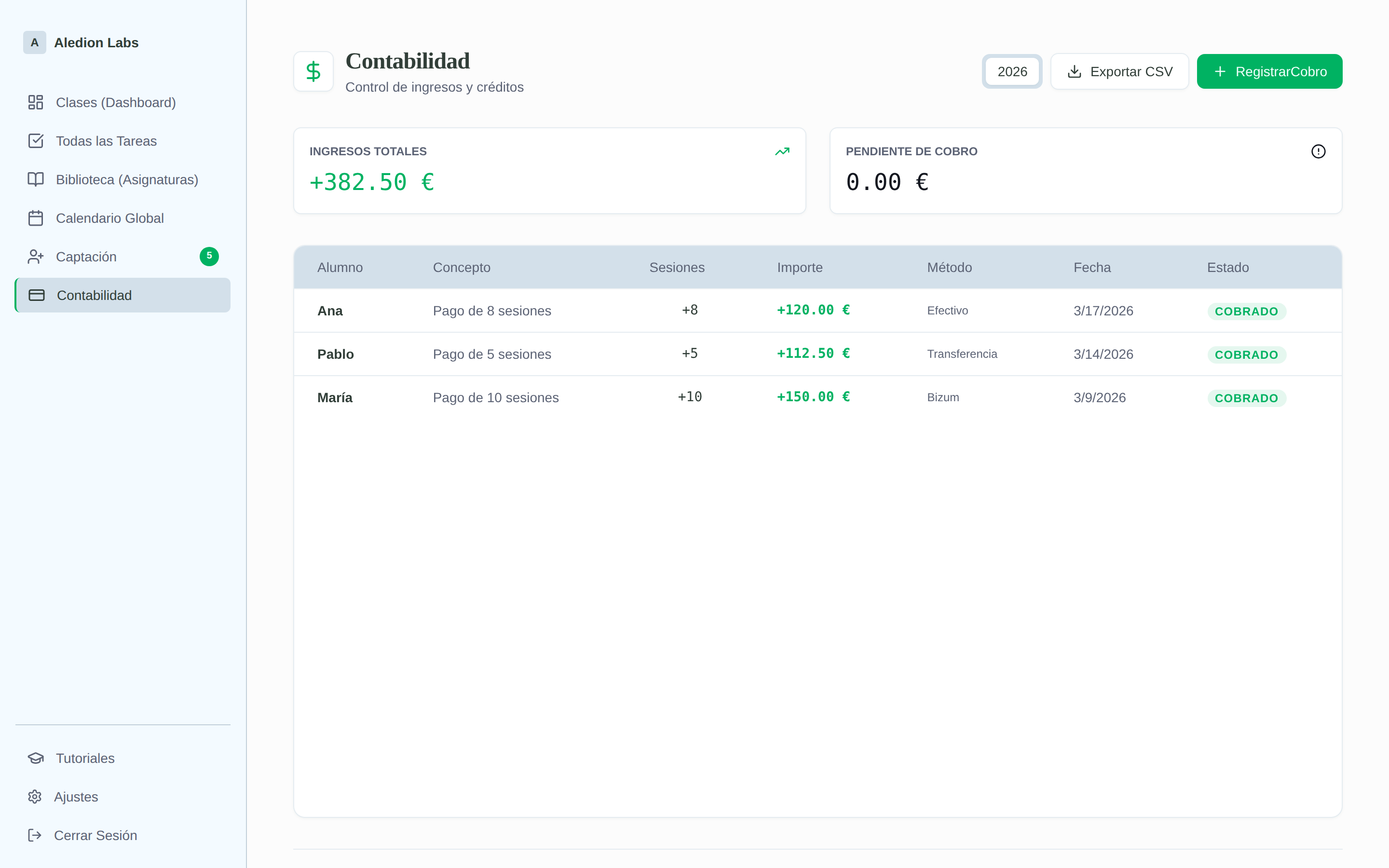 tusalumnos.com usa un modelo de créditos: cuando registras un pago de un alumno, se le acreditan sesiones. Cada vez que creas una clase, se descuenta automáticamente un crédito del balance del alumno.